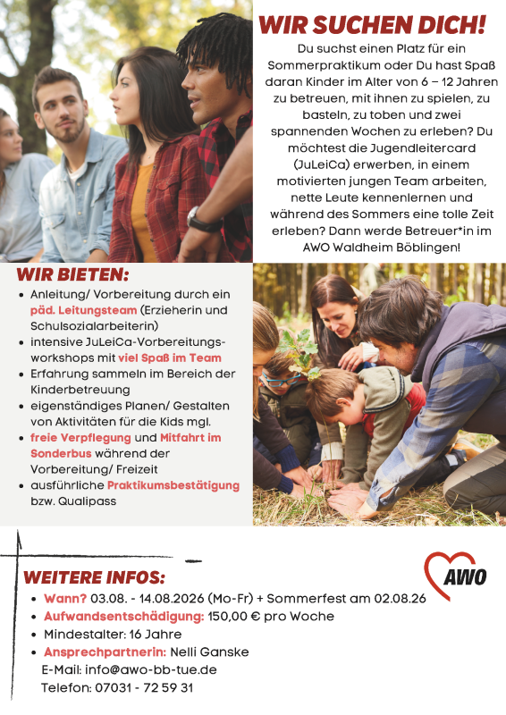 Als Betreuer*in im AWO-Waldheim hast Du jede Menge Vorteile. Du lernst nicht nur nette, neue Leute kennen, während der Vorbereitung und der Waldheimfreizeit ist jede Menge Spaß und Action garantiert. Die Verpflegung während der Vorbereitungswochenenden und der Freizeit sind für Dich inklusive. Du hast die Möglichkeit die JuLeiCa zu erwerben, die Jugendleiter-Card. Mit dieser hast Du jede Menge Vorteile. Welche? Schau auf www.juleica.de !